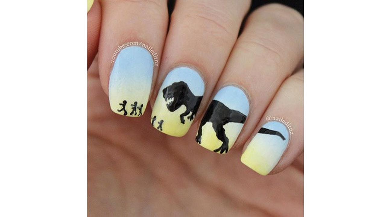 Kreativitas membuat cat kuku unik terceminkan pada desain di atas. Dengan uniknya, cat kuku didesain seolah-olah sedang dikejar Dinasaurus. Pemilihan warna kalem yakni biru muda dan kuning, membuat kuku berdesain dikejar dinasaurus ini tampak apik.
